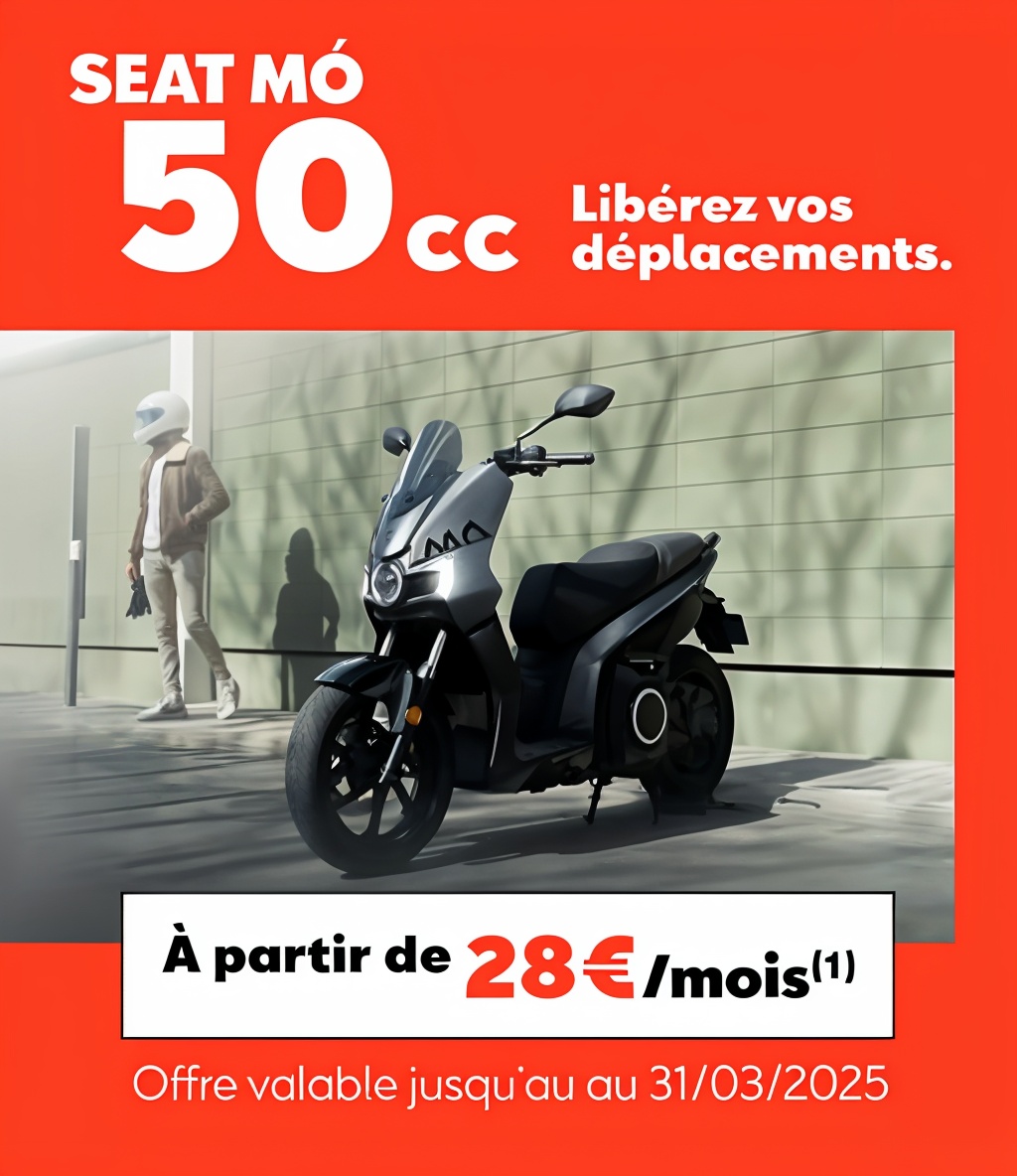 Location avec Option d’Achat pour une SEAT MÓ eScooter 50 vendu au prix tarif de 5 900 € ramené à 2 154€ après déduction de la remise de 3 746 €. Option d’achat finale : 1 622,50€ ou reprise du véhicule sous conditions du distributeur. Montants exprimés TTC. Offre réservée aux particuliers chez tous les distributeurs SEAT MÓ (France métropolitaine) présentant ce financement et valable jusqu’au 31/03/2025 pour toute commande d’une SEAT MÓ 50 eScooter passée et livrée avant le 31/03/2025 dans la limite des stocks disponibles. Offre sous réserve d’acceptation du dossier par VOLKSWAGEN BANK GMBH - SARL de droit allemand - Capital social : € 318 279 200 - Siège social : Braunschweig (Allemagne) - RC/HRB Braunschweig : 1819 - Intermédiaire d’assurance européen : D-HNQM-UQ9MO-22 (