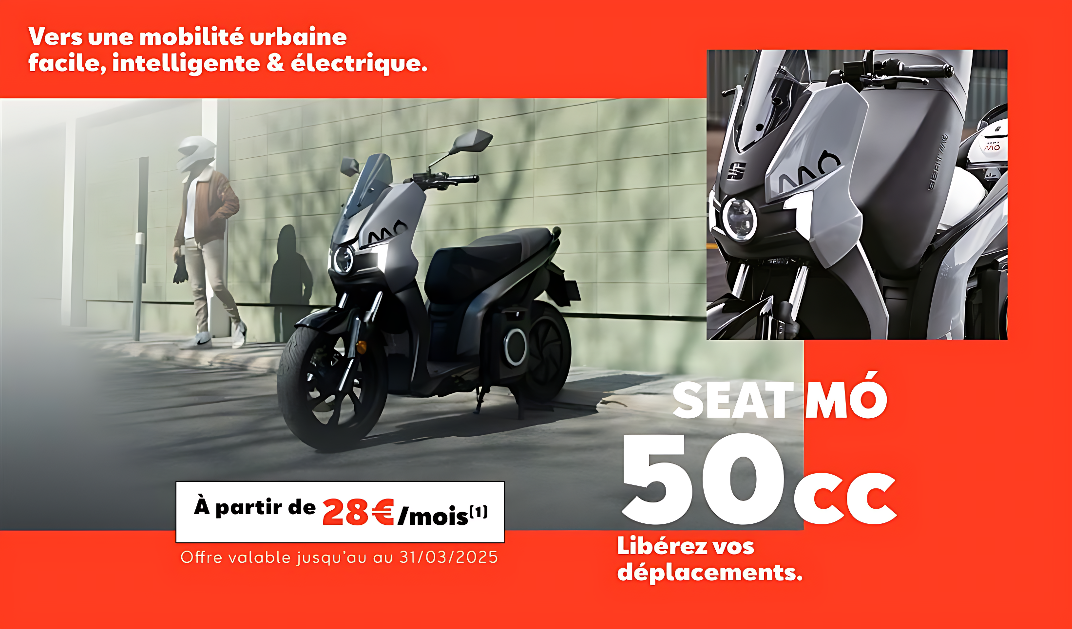 (1) SEAT MÓ 50 eScooter à partir de 28 €/mois sans apport. Location avec Option d’Achat sur 37 mois et 15.000 Km. 36 loyers de 27,75 €, déduction faite de l'offre de remise de 3 746 €.